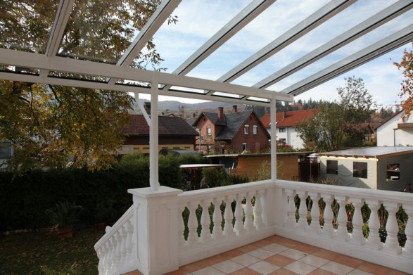 Hier sehen Sie eine Bilder von Terrassenüberdachungen mit Glaseindeckung bzw. Glasfüllung. Glas muß zwar auch ein bis zweimal im Jahr gereinigt werden, ist dann aber wieder klar und transpartent wie am ersten Tag.